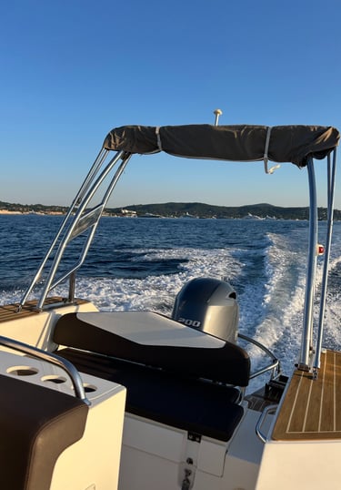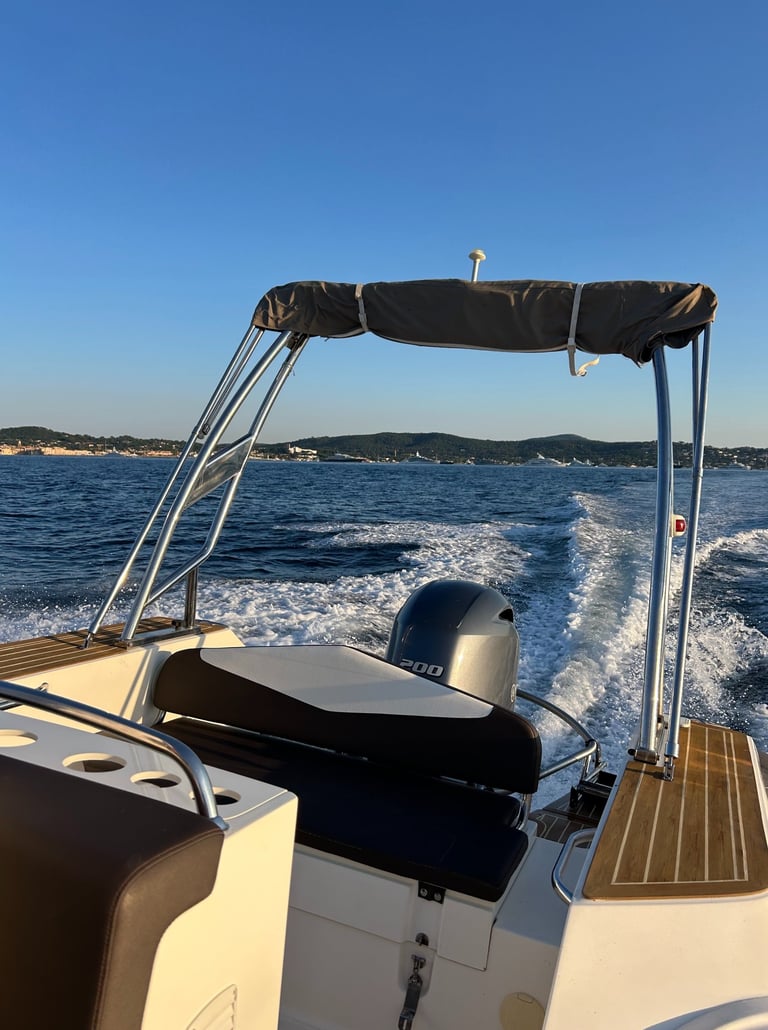 🚤 Notre bateau : le Tempest 700, équipé d’un moteur de 200 chevaux, vous garantit puissance, confort et style pour explorer les plus belles criques de la Côte d’Azur.
